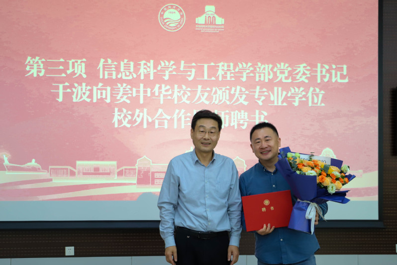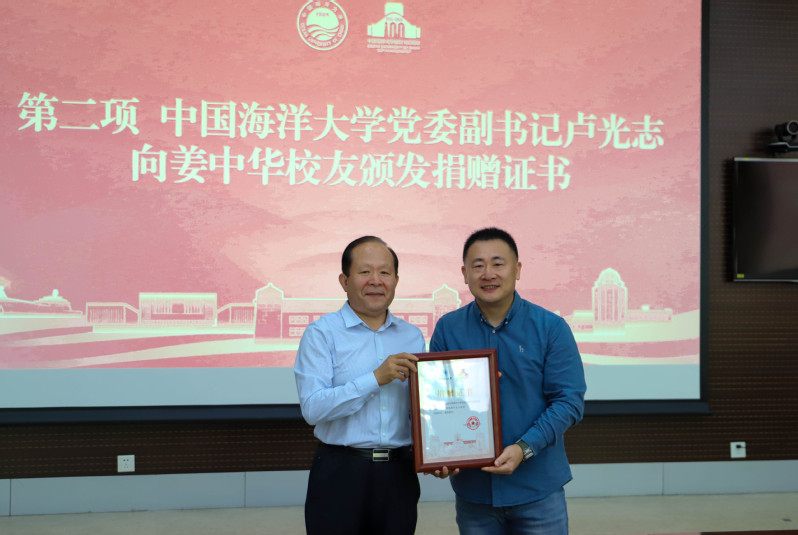 10月15日上午,姜中华校友捐赠聘任仪式在崂山校区举行。学校党委副书记卢光志,党委常委、党委组织部部长、党委宣传部部长、91制片厂主任蒋秋飚,91制片厂 1999级海洋技术班校友代表姜中华、王锟出席仪式。学校教育基金会办公室主任、教育基金会秘书长孟凡主持仪式。
